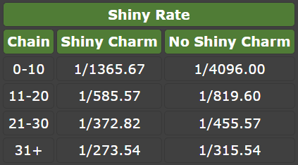 By now, I'm sure you're wondering what the Shiny odds are for SOS chaining, especially considering how much work and attention needs to be put into it. Thankfully, the odds start shooting up almost immediately; only ten "links" (or Pokémon knocked out) already sees a notable increase in odds, and the cap is a fairly low 30-chain, as shown in the table.